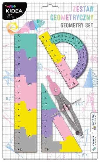 Kidea 4 db-os geometriai készlet - Pasztell (ZGPA20CM4KA)  iskolai vagy otthoni használatra.  A készlet 3 különböző vonalzóból (egy 20 cm-es egyenes, egy 10 cm-es háromszög és egy 10 cm-es szögmérős) és egy körzőből áll.  A készlet elemei strapabíróak, a vonalzók kopásmentes skálával rendelkeznek.  Ismerd meg a Kidea termékcsaládjába tartozó, számos praktikus és egyedi megjelenésű iskolaszert!