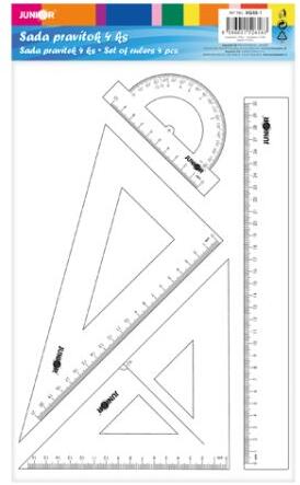 4 részes rajzvonalzó készlet, átlátszó műanyagból. A készlet tartalmaz egy 17 cm-es vonalú háromszöget, egy 24 cm-es derékszögű háromszöget, egy 30 cm-es vonalzót és egy 10 cm-es szögmérőt. Műanyag tokba csomagolva. Kiváló minőségű, megfizethető készlet, amelyet a JUNIOR saját márkanév alatt kínál.