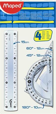 Tulajdonságok: Anyag: műanyagKönnyen olvasható számskálaA szett tartalma:1 db 15 cm-es vonalzó1 db 60°-os, 12 cm-es számskálájú vonalzó1 db 45°-os, 12 cm-es átfogójú vonalzó1 db 180°-os, 10 cm-es szögmérő