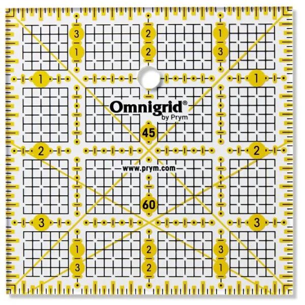 PRYM - Omnigrid patchwork vonalzó A körkés és vágólap mellett elengedhetetlen kelléke egy foltvarró készletnek. Kiváló minőségü műanyagból készül. Körkés használatára tervezve. A körkés pengélye tökéletesen siklik a vonalzó éle mellett. Inch jelölésekkel. 300, 450 és 600 jelölésekkel. Sárga és fekete jelölésekkel, hogy világos és sötét anyagokon is láthatóak legyenek. Mérete: 4x4 inch