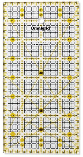 PRYM - Omnigrid patchwork vonalzó A körkés és vágólap mellett elengedhetetlen kelléke egy foltvarró készletnek. Kiváló minőségü műanyagból készül. Körkés használatára tervezve. A körkés pengélye tökéletesen siklik a vonalzó éle mellett. Inch jelölésekkel. 300, 450 és 600 jelölésekkel. Sárga és fekete jelölésekkel, hogy világos és sötét anyagokon is láthatóak legyenek. Mérete: 4x8 inch