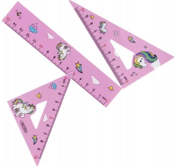Vonalzók észlet, műanyag, 3 db-os Unikornis  iskolai vagy otthoni használatra. A hajlékony műanyagból készült vonalzót a kisiskolások nagyobb biztonsággal használhatják, rugalmassága miatt nehezen törik. A készlet különböző hosszúságú és típusú vonalzókból áll.