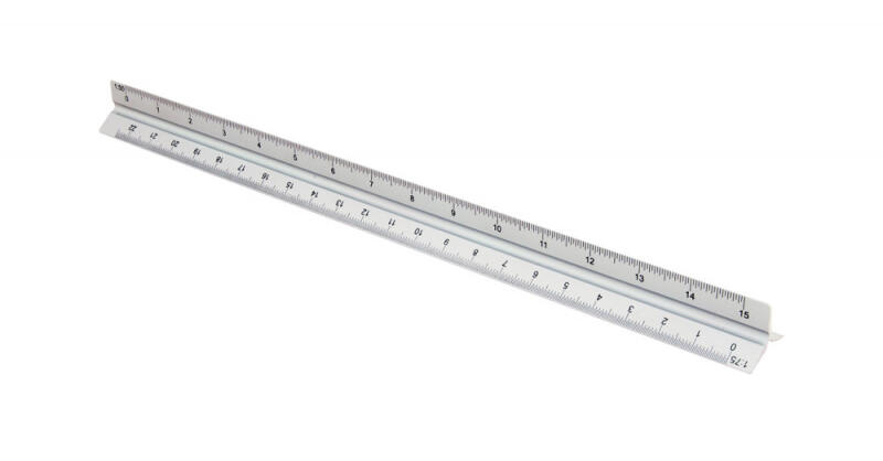 Háromszögletű, alumínium méretarány vonalzó. 30 cm-es vonalzóval és 1:20/1:25/1:50/1:75/1:100 méretarányú skálákkal.