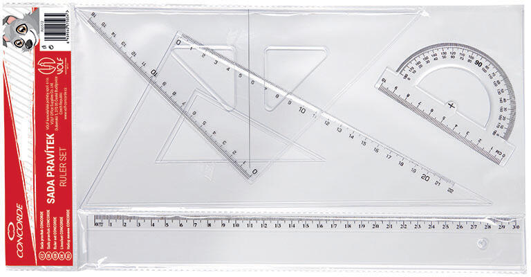 4 db átlátszó vonalzóból álló készlet csomagolásban.