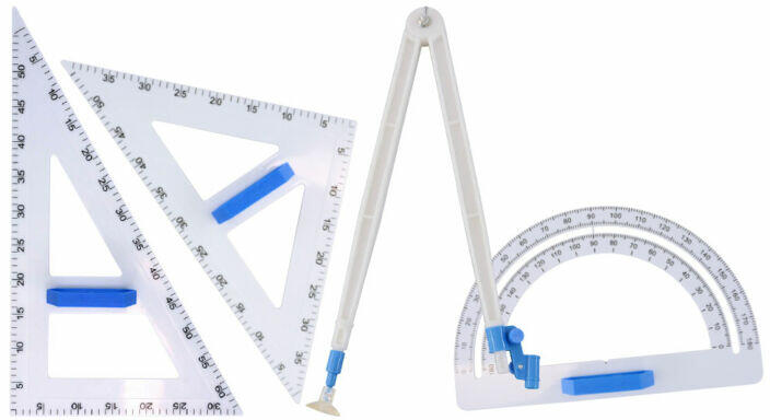 Táblához való tanári készlet. A csomag 4 különböző eszközt tartalmaz, melyek nagyszerű lehetőséget nyújtanak a geometriai szerkesztések bemutatásához, szemléltetéséhez, illetve alsós korosztálynál az eszkzözhasználat helyes elsajátításának megtanításához. Anyaga: műanyag. Tartalma:körzőszögmérő2 db háromszögvonalzó.
